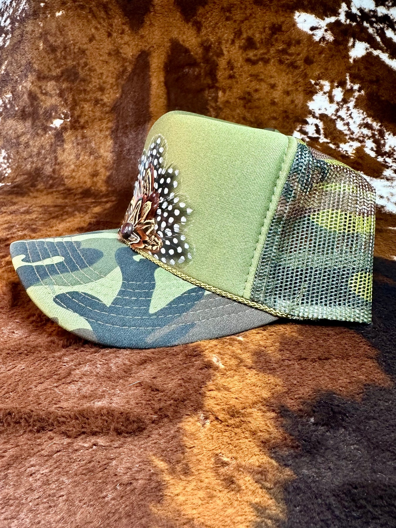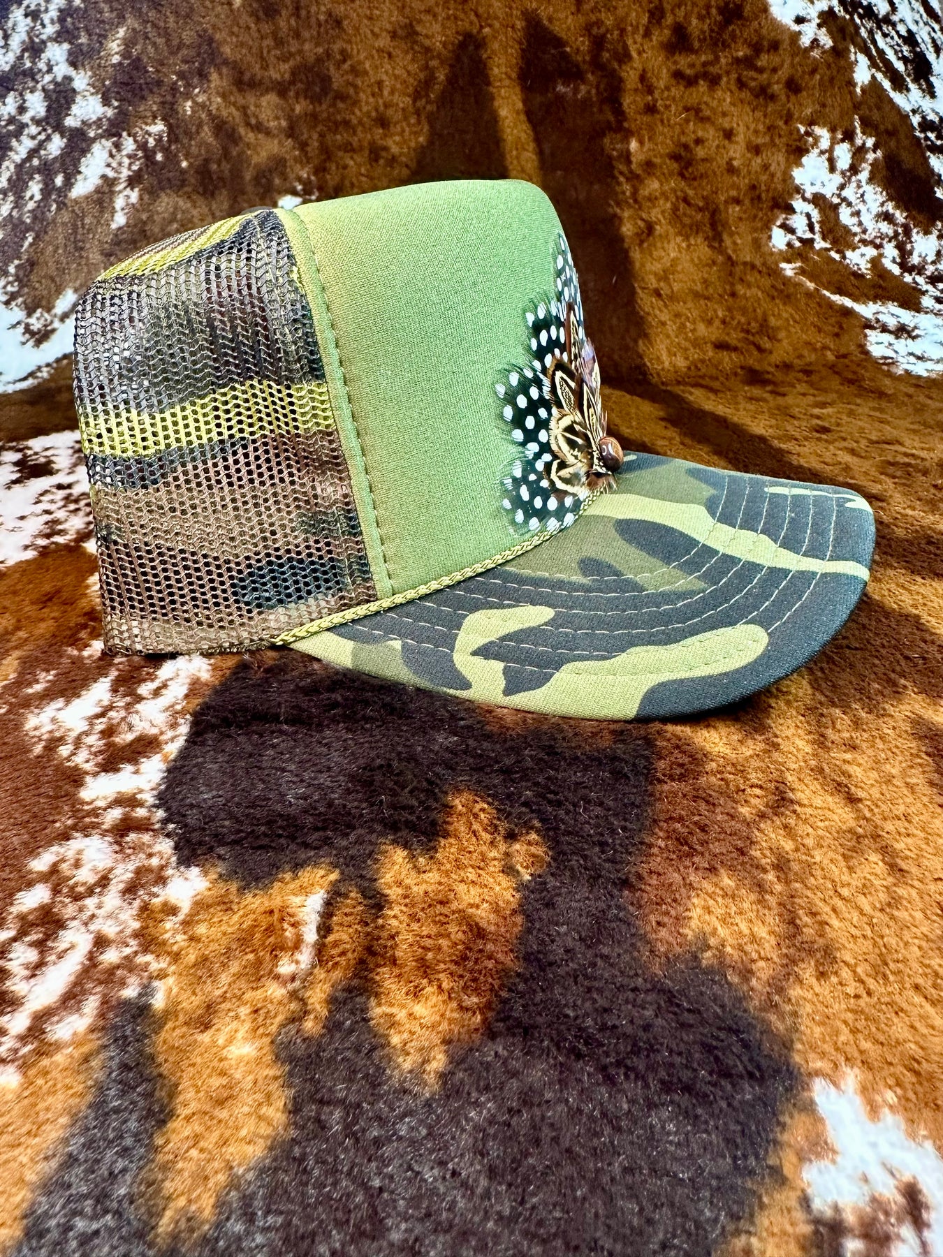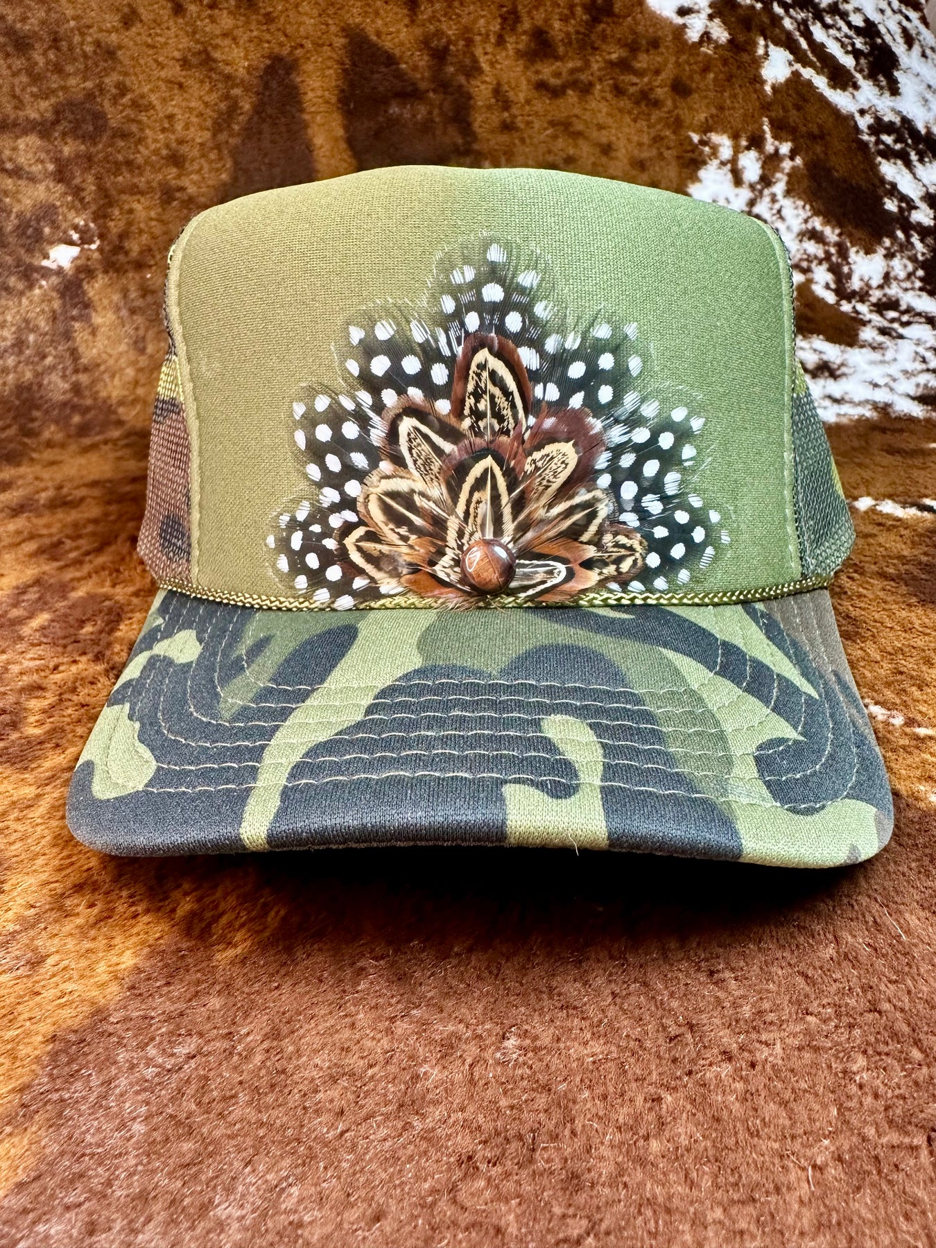 This camo feather trucker hat blends rugged camo style with handcrafted feather detail for a bold yet wearable statement.