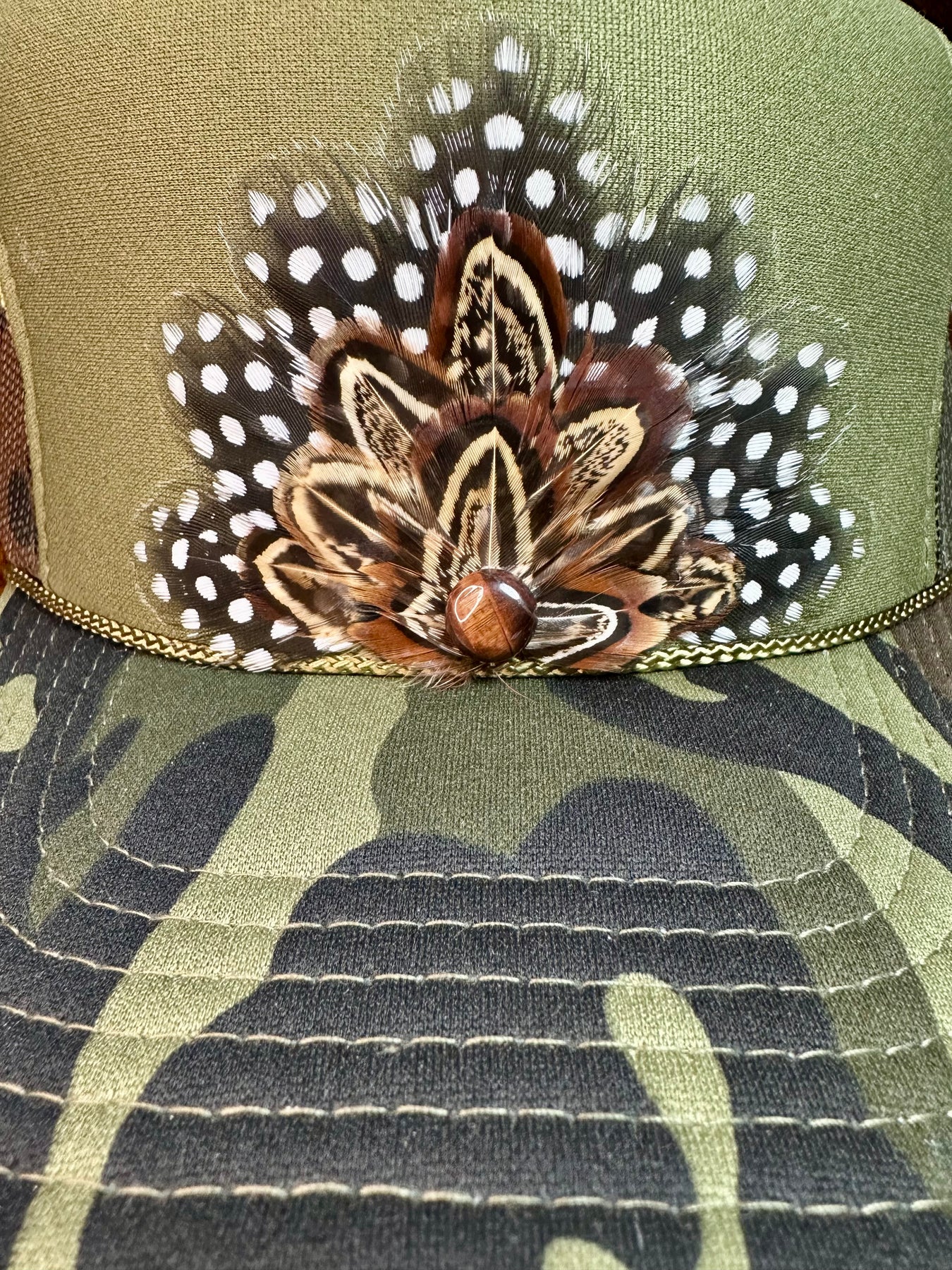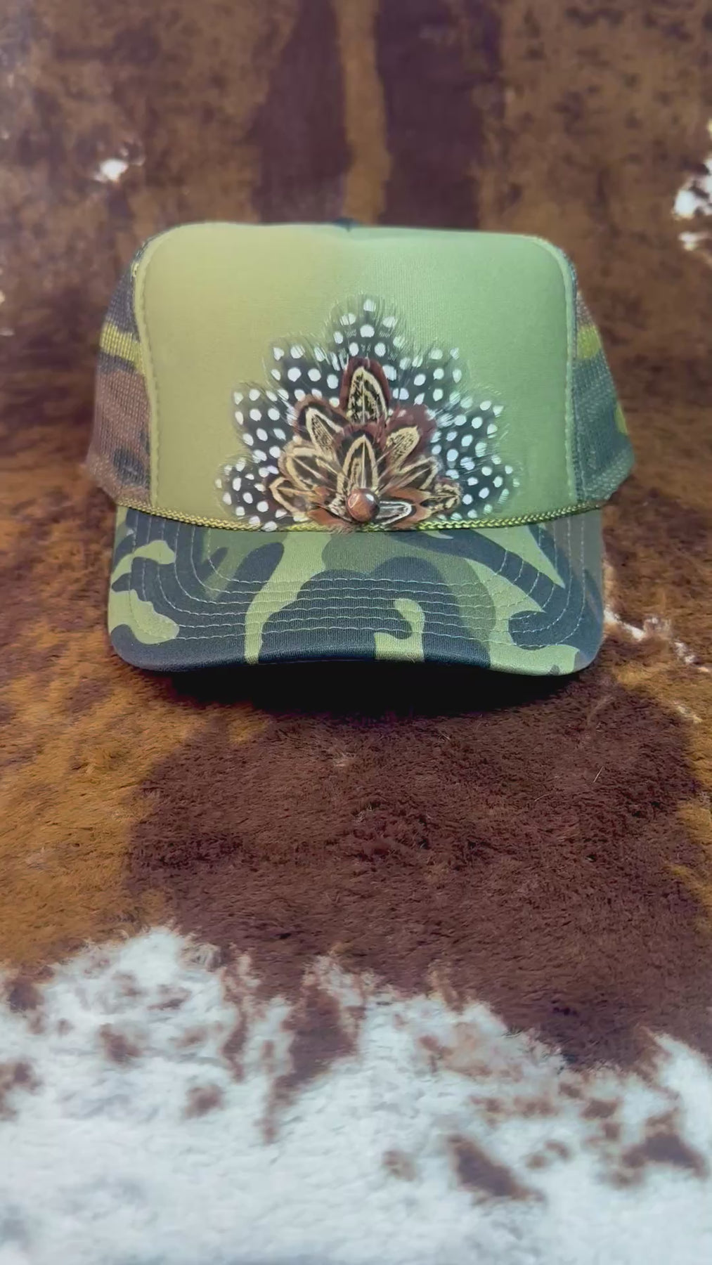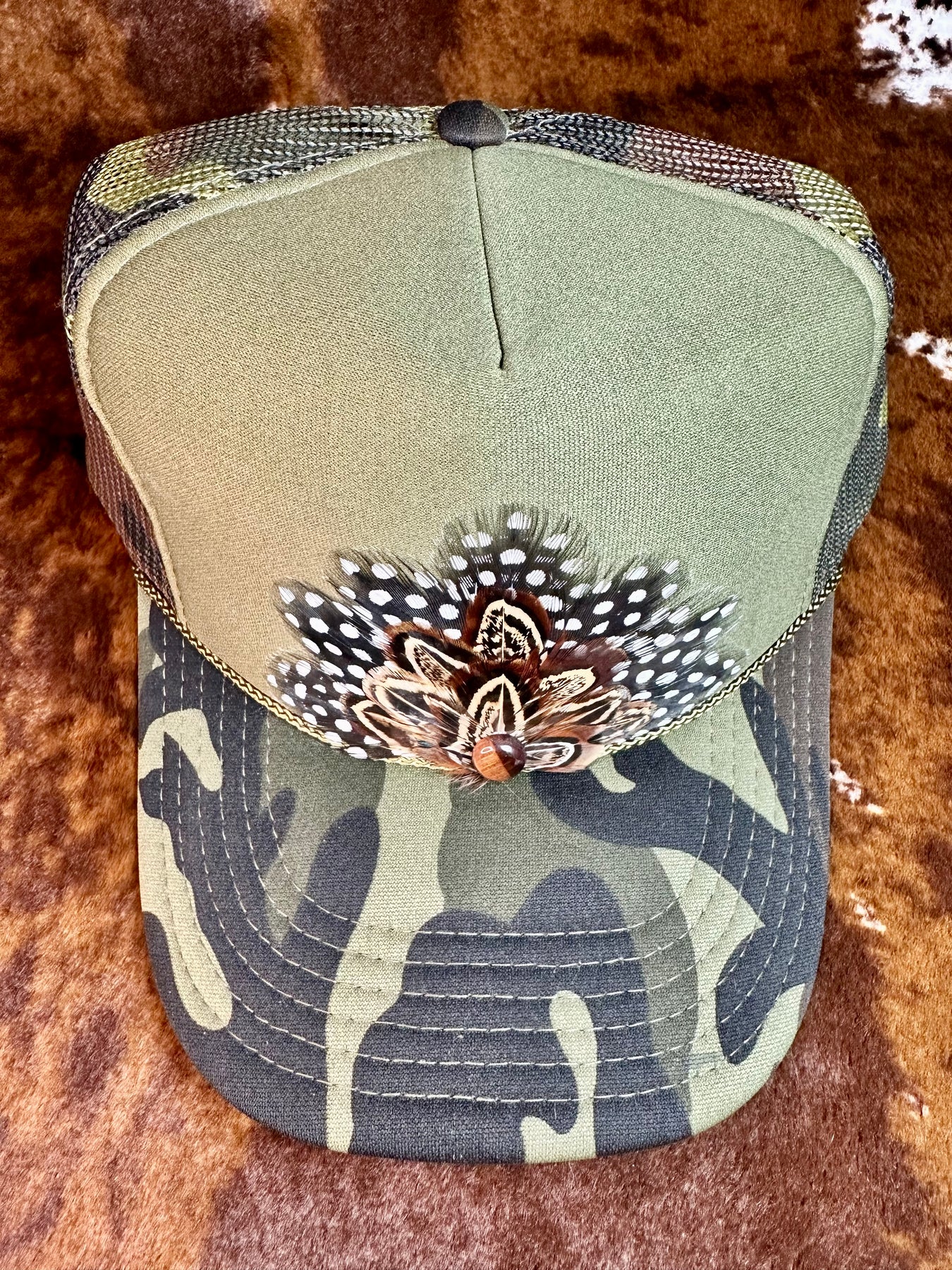 This camo feather trucker hat blends rugged camo style with handcrafted feather detail for a bold yet wearable statement.